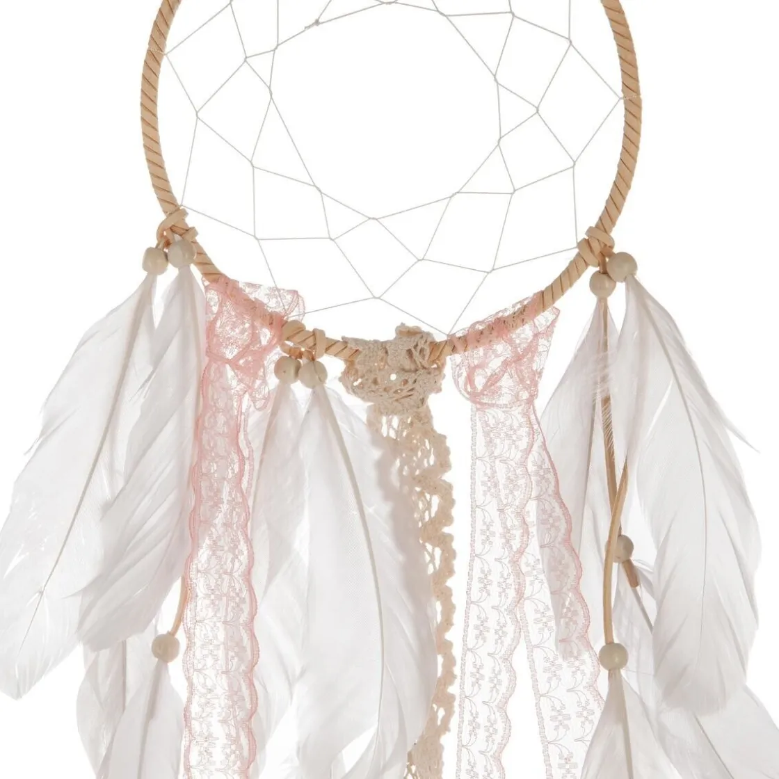 Les petites filles adorent tout ce qui ressemble de près ou de loin à de la dentelle et à des plumes. Ça tombe bien. Cet attrape rêves enfant en a partout.