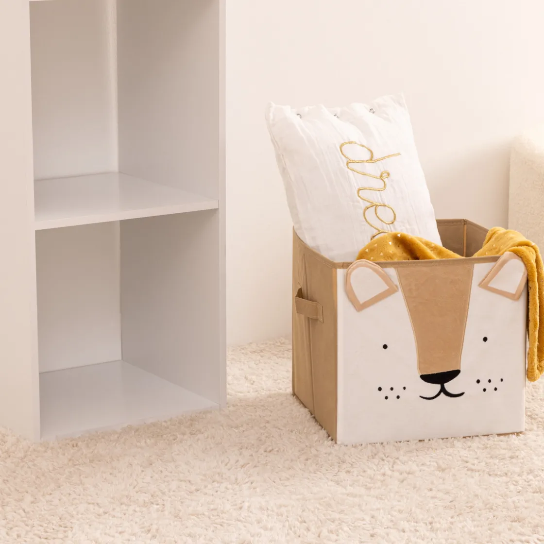 La face avant de ce cube de rangement est décorée avec le visage avenant d’un lion. Grâce à ses oreilles en relief et sa matière en velours toute douce, mettre de l’ordre ne sera plus une corvée pour votre petit.