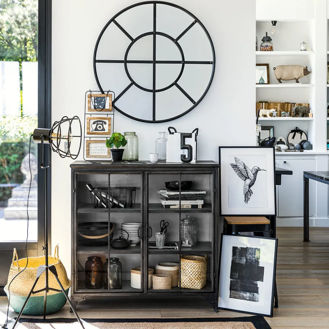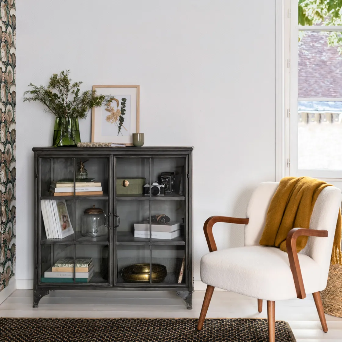 Structure en fer patiné et portes rehaussées de larges carreaux de verres : le buffet « Broc » séduit avec son style vintage. Les pieds à l’effet clouté renforcent l’esprit industriel de ce meuble rétro.