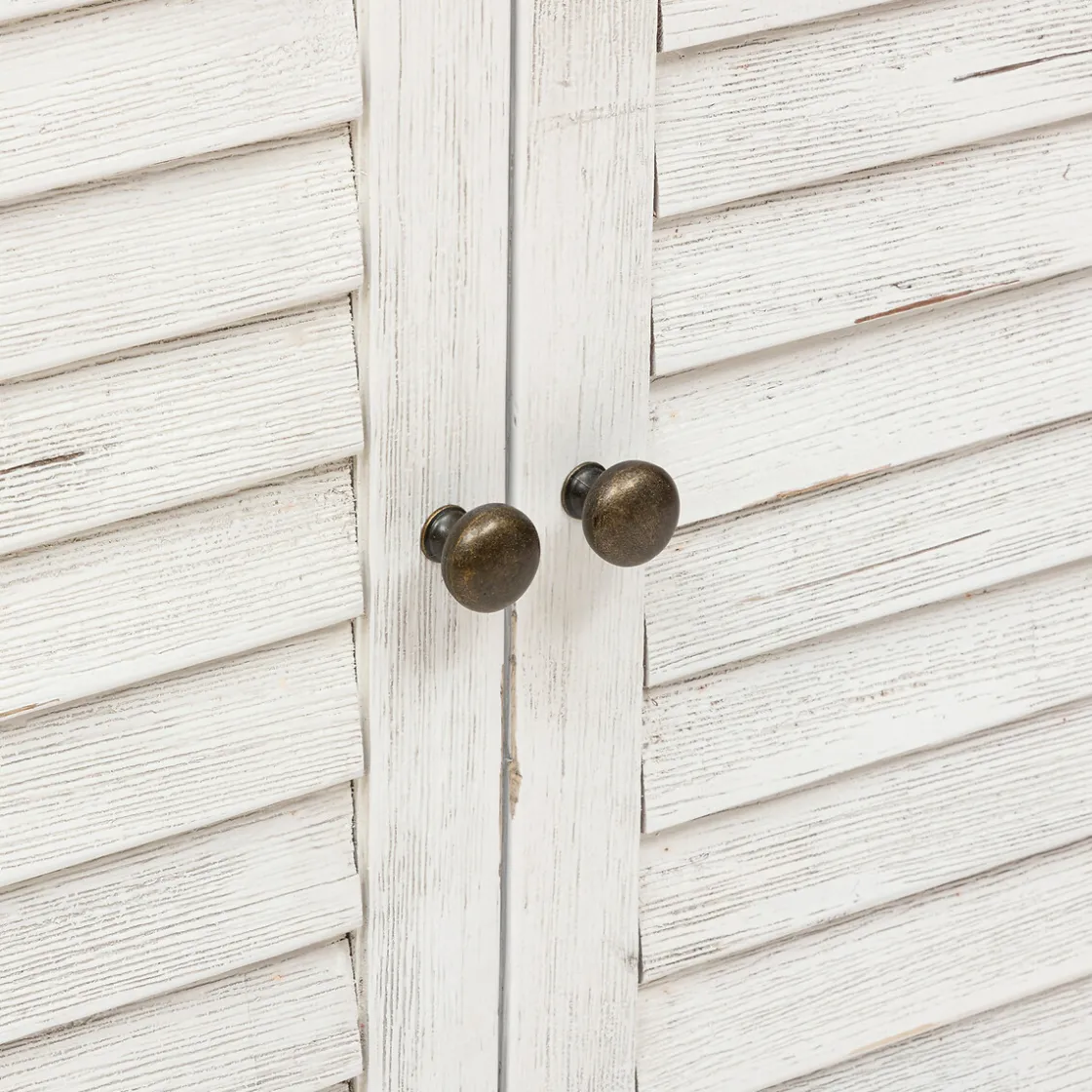 Réalisé en bois, le buffet 2 portes « Olbia » vous permettra de ranger votre vaisselle et de placer des objets déco sur le plateau supérieur, laissé naturel et contrastant avec les portes de placard cérusées. Les lattes des portes et les poignées en métal créent un ensemble authentique.