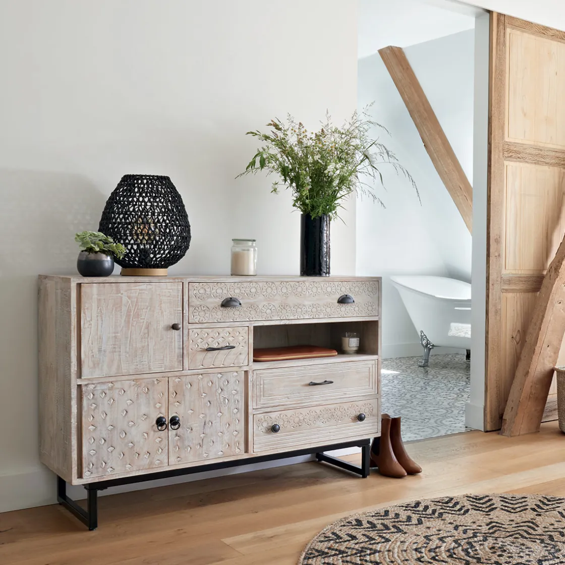Ce joli bahut sculpté à la main et patiné en Inde, multiplie les rangements.