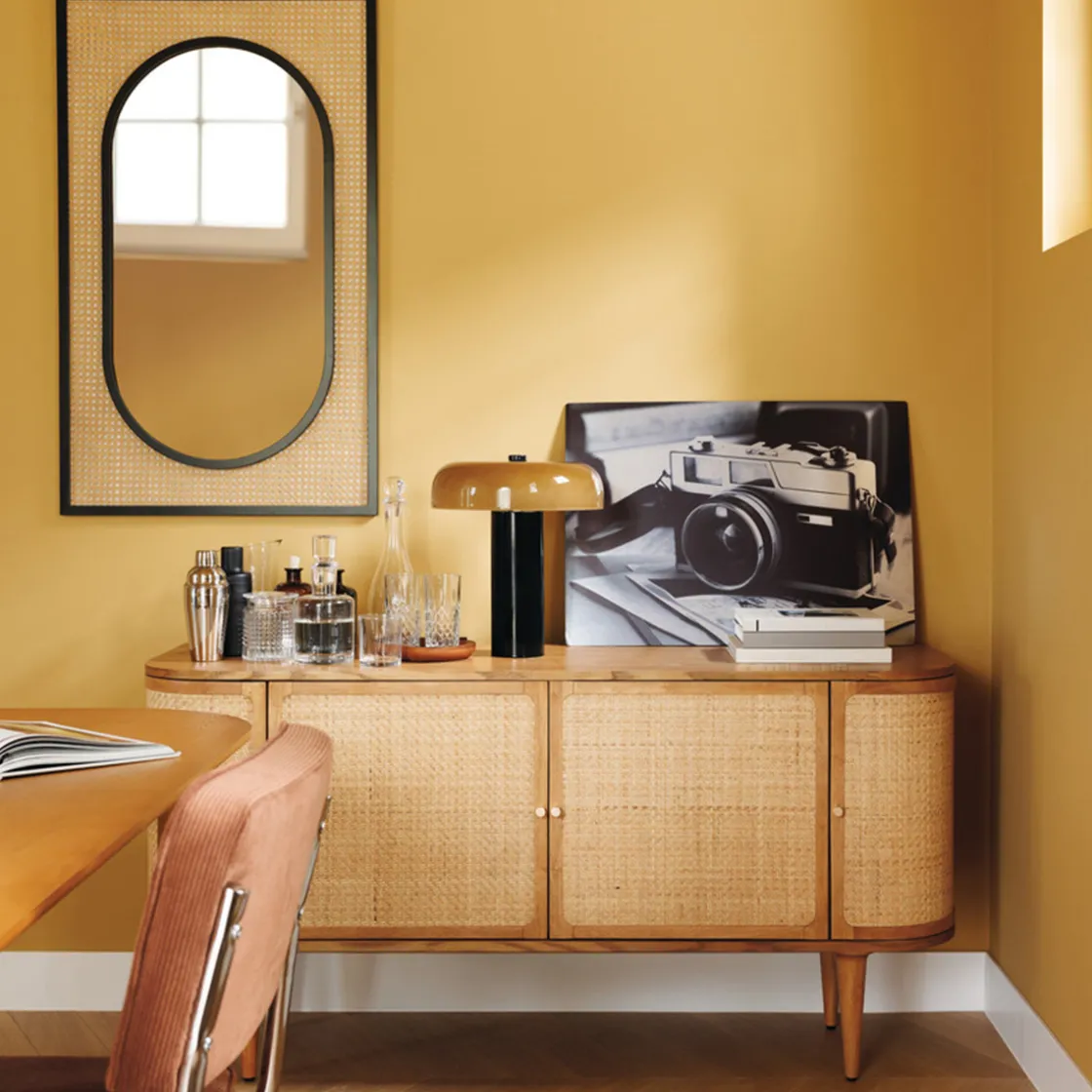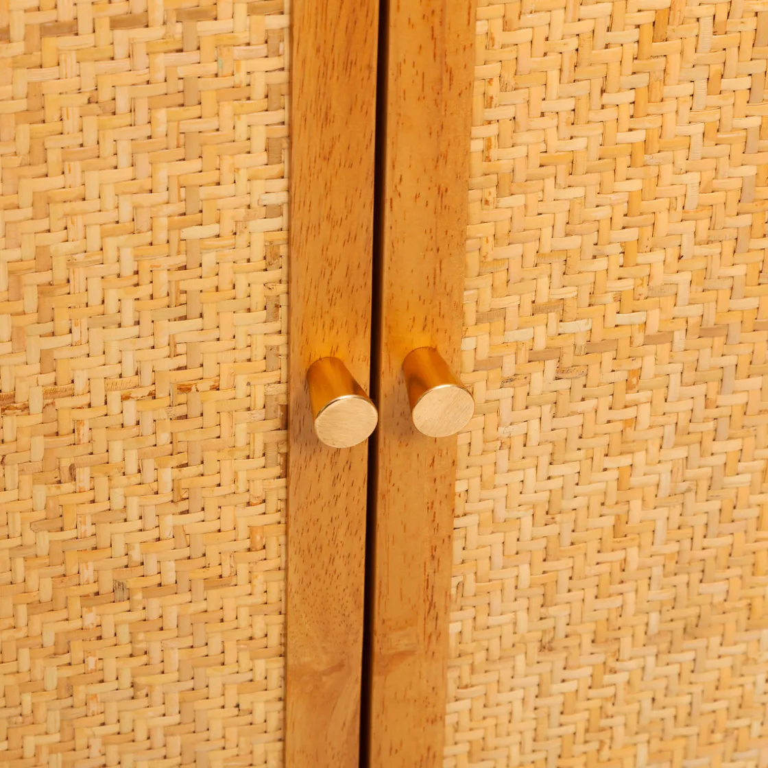Ce buffet arbore un joli mélange de matières sur les portes avec la structure en bois, le cannage en rotin et les poignées en métal doré. Il possède aussi un design incurvé pour les portes extérieures, ce qui lui donne tout son charme.