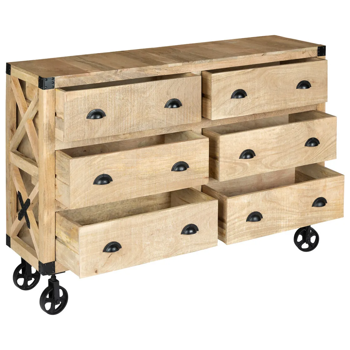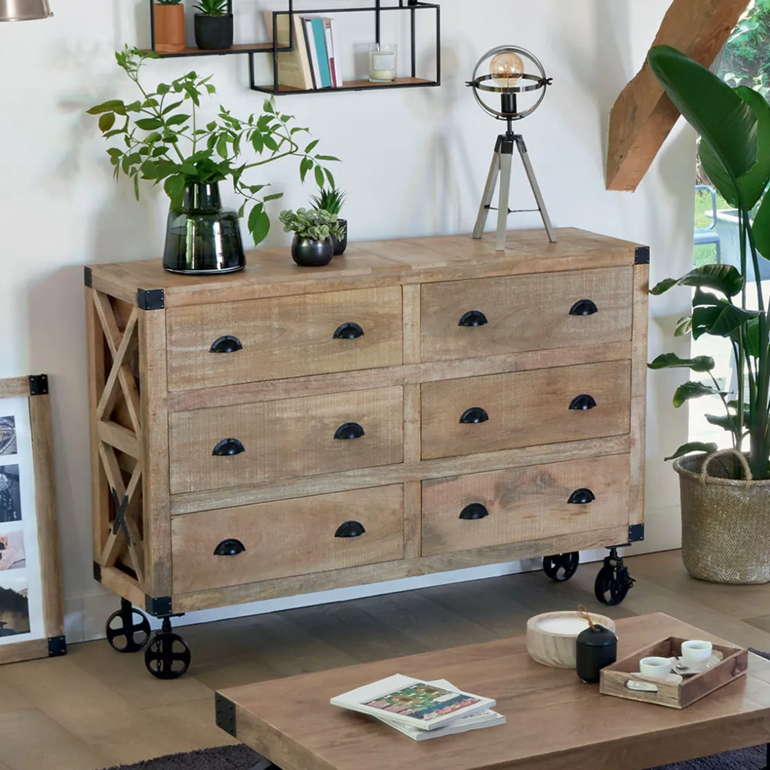 On apprécie le design épuré du buffet « Silas » ainsi que sa praticité. Réalisé en bois de manguier, il est résistant, mais aussi fonctionnel : il est composé de six tiroirs disposés sur des roues en métal.