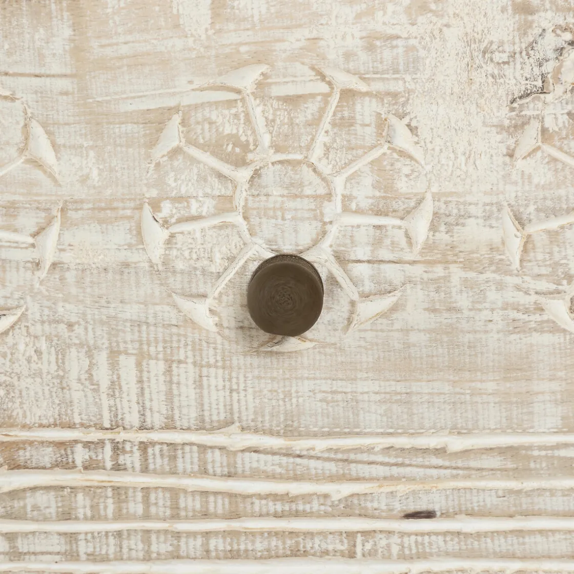 En bois sculpté à la main en Inde, son originalité réside dans son design : six tiroirs disposés de façon asymétrique les uns sur les autres, avec des poignées différentes pour chacun.