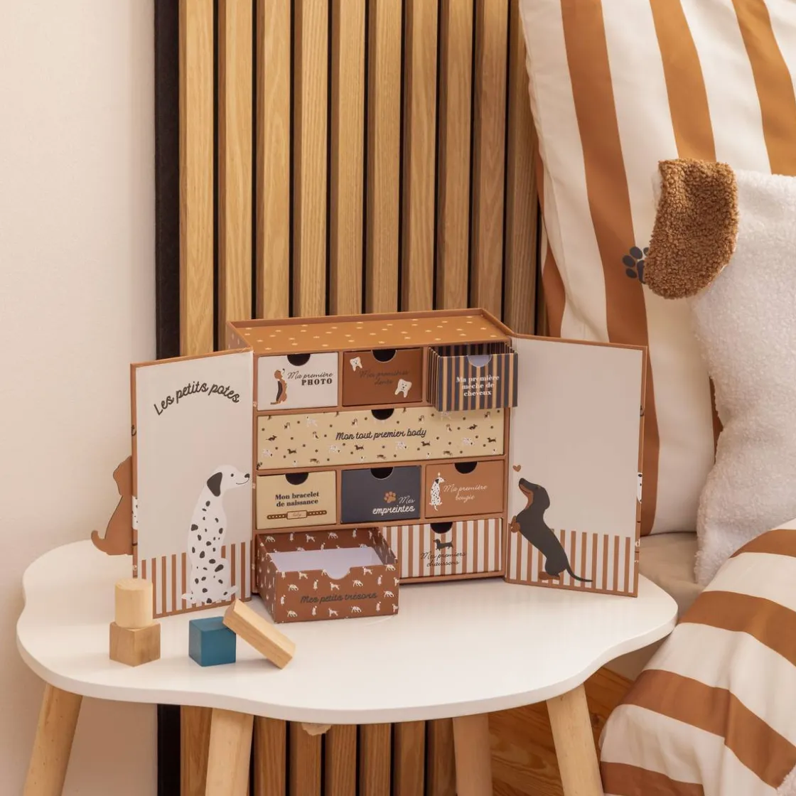 Conçu en carton imprimé d’illustrations de petits animaux, le coffret-cadeau Cilia Atmosphera for kids s’ouvre facilement grâce à deux volets aimantés. À l’intérieur, 9 tiroirs vous permettront de conserver les premiers souvenirs de votre enfant, puis de les lui faire découvrir au fil du temps. Ludique et précieux, ce coffret aux dimensions harmonieuses pourra être posé sur une étagère en rotin comme sur une commode de rangement.