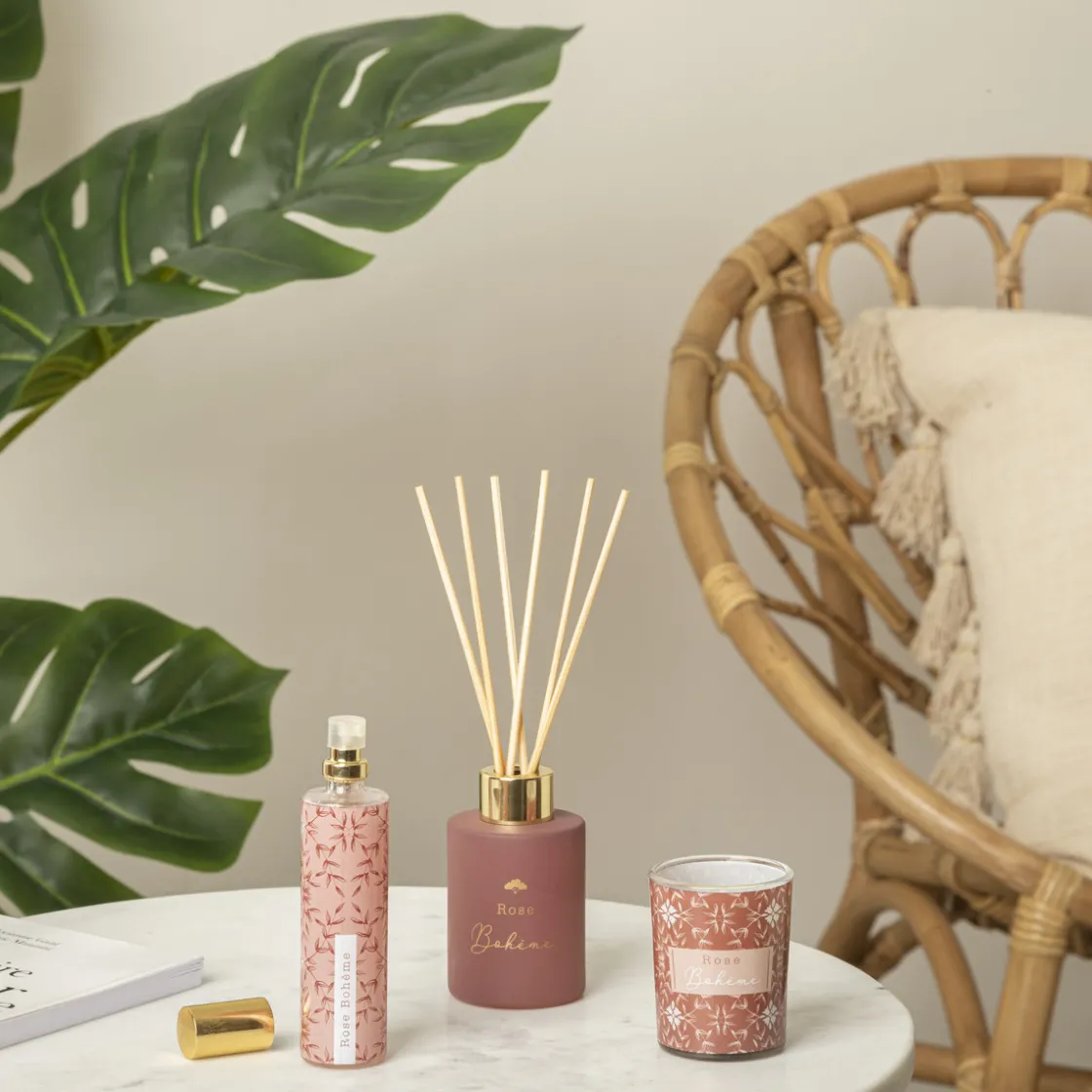 Les éléments de ce coffret possèdent un parfum délicat qui enveloppera toute la pièce. À vous de choisir votre sillage olfactif : épicé, floral ou oriental. Vous aurez à votre disposition trois accessoires : une bougie dans un contenant en verre à motif, un flacon d’huile parfumée* et un diffuseur avec bâtonnets en rotin.
