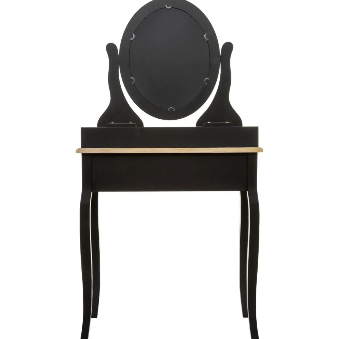 Cette coiffeuse a tout pour plaire, à commencer par ses pieds galbés en bois de pin. Ses tiroirs aux poignées joliment travaillées et son miroir ovale la complètent pour créer un ensemble harmonieux.