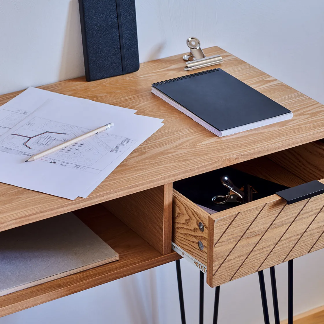 Le plateau robuste est en fibres de bois avec un placage en frêne. Les pieds graphiques et les poignées des deux tiroirs sont en fer. Le style urbain de ce meuble s’intègrera à merveille dans un décor sobre.