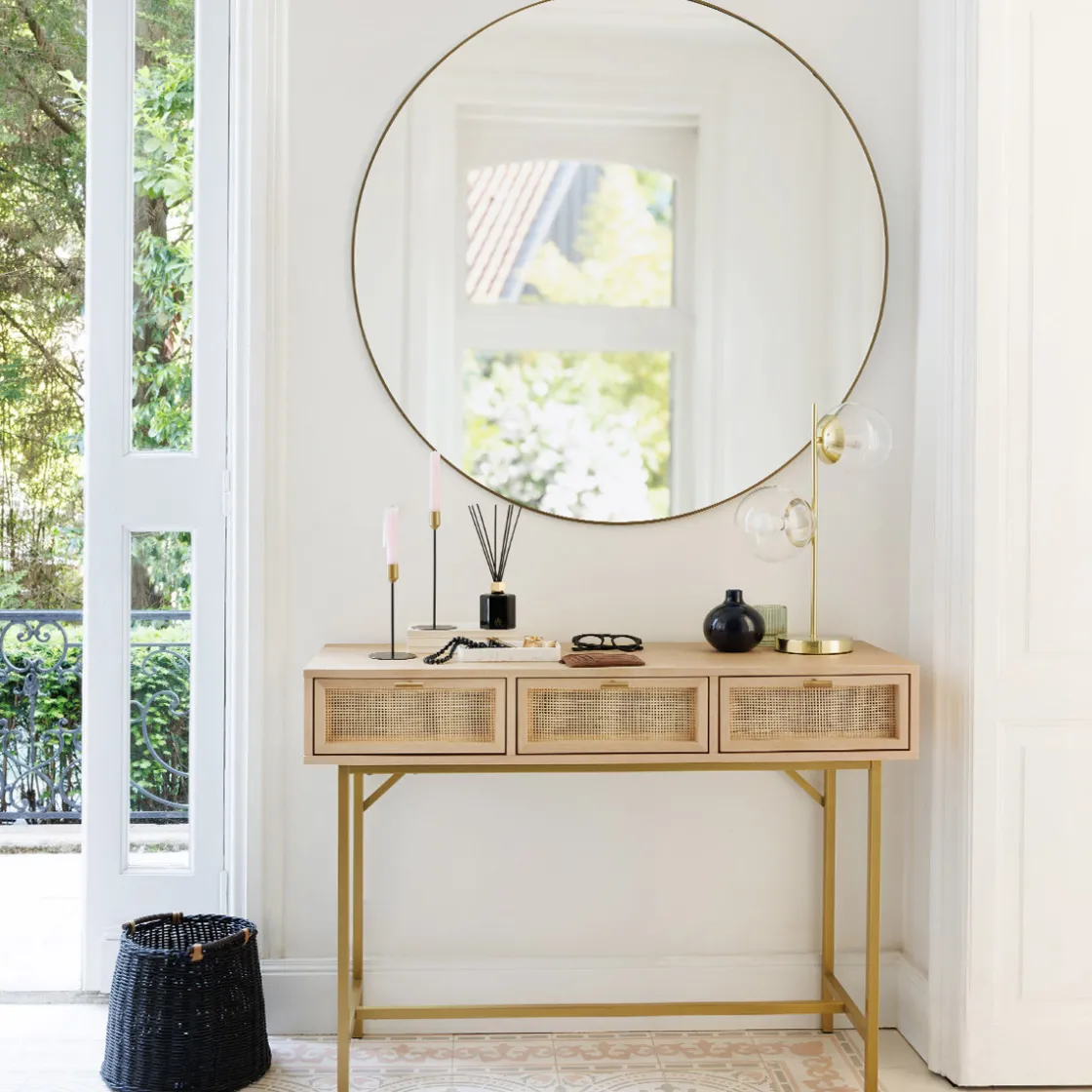 Pour une entrée élégante et originale, accrochez un grand miroir Atmosphera en rotin doré au-dessus de votre console.