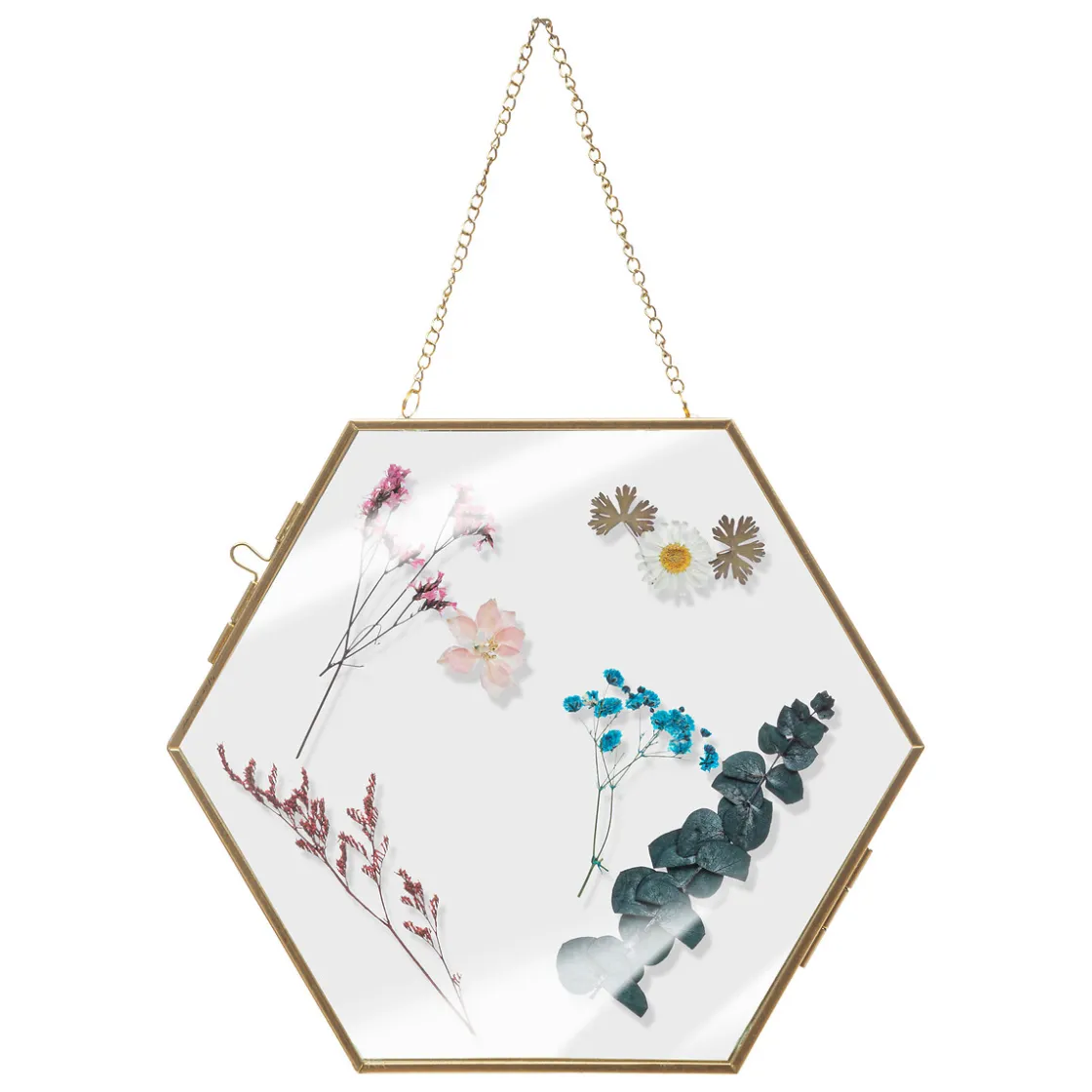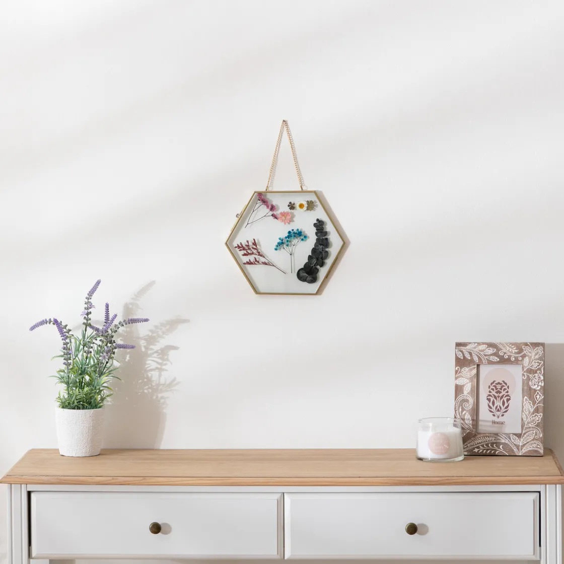 Poétique et délicate, la déco murale « Clea » est composée de verre, serti dans une structure en métal au fini laiton. L’ensemble abrite une composition de fleurs séchées que vous pourrez renouveler à l’envi! Cette déco murale se suspend très facilement au mur grâce à une chaînette.
