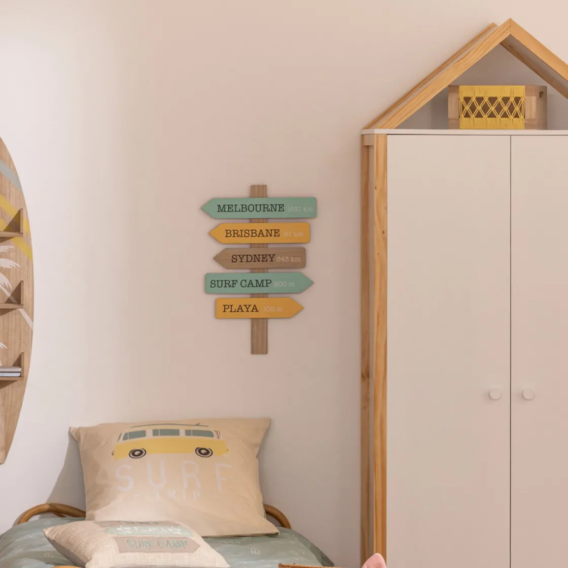 La décoration murale « Hawa » a la forme d’un panneau directionnel en bois qui indique différentes destinations australiennes. Elle apportera une touche vintage dans la chambre à coucher de votre petit. Pour l’installer, cette pancarte se fixe simplement au mur à l’aide d’un crochet.
