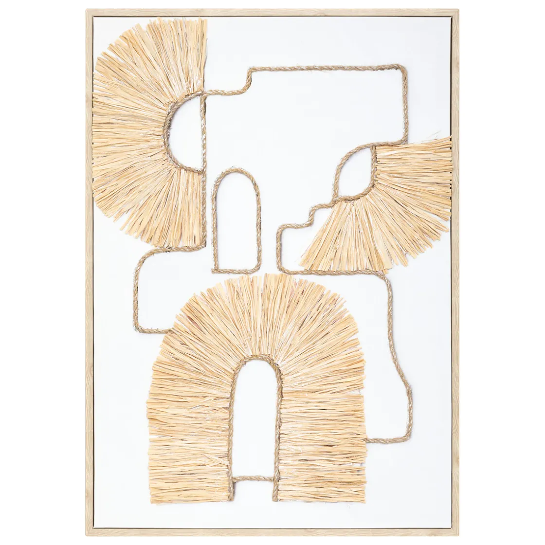 Placée dans un cadre rectangulaire en bois, la déco murale « Inaya » obéit à des dimensions harmonieuses qui lui permettront de trouver sa place même dans de petits espaces. Elle se distingue par ses motifs composés de raphia tressé et de feuilles, qui se mélangeront parfaitement à des matières naturelles comme le bois exotique ou le rotin.