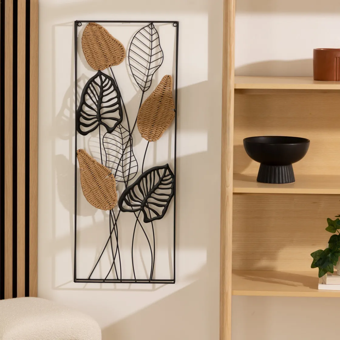 Ajoutez un lampadaire ou une suspension en métal près de votre déco murale afin de l’éclairer et de la mettre en valeur lors de vos soirées.