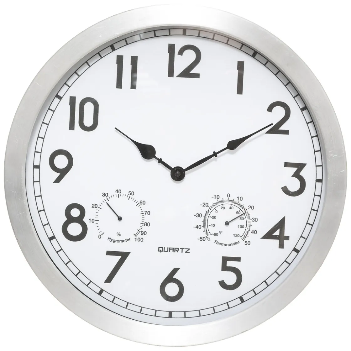 Cette horloge d’extérieur de 40 cm de diamètre est réalisée en aluminium brossé et offre un cadre vitré. Équipée d’un mécanisme silencieux, elle dispose d’un hygromètre et d’un thermomètre. Sobre et contemporaine, cette horloge fonctionne grâce à des piles. Vous pourrez la fixer facilement au mur sur une terrasse.