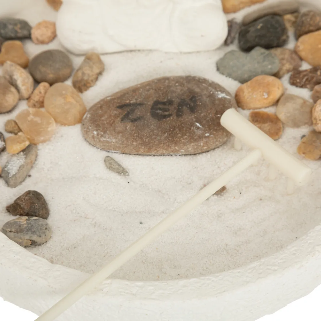Ce jardin japonais miniature accompagnera vos moments de relaxation. Le plateau rond accueille une statuette de Bouddha assis en ciment et des petites pierres. Le râteau vous permettra de jouer doucement avec le sable pour un effet très apaisant.