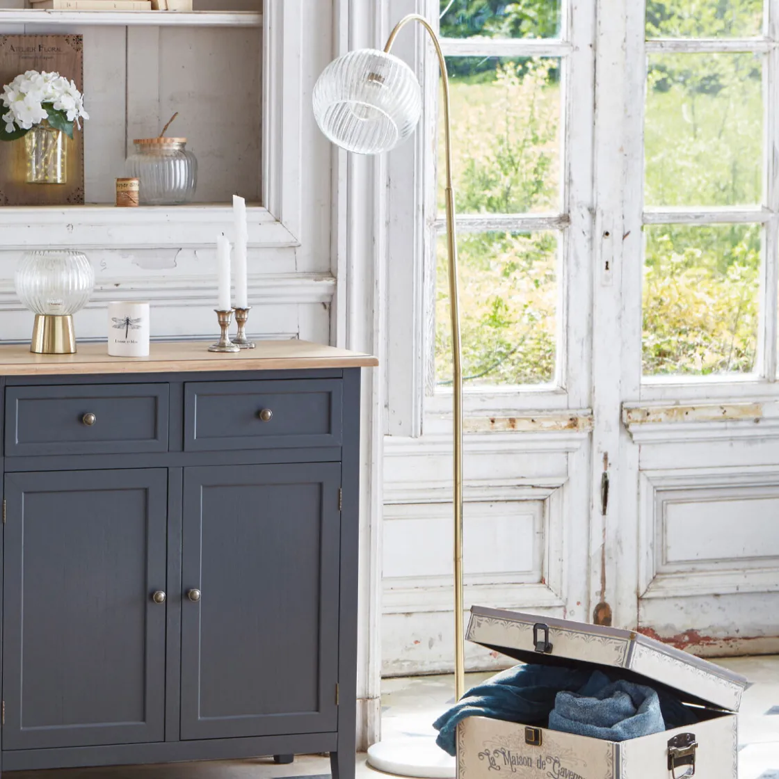 Pour composer un coin lecture cocooning, associez ce lampadaire arc « Laye » avec un fauteuil enveloppant en tissu Atmosphera. Placez l’ensemble près d’une bibliothèque.