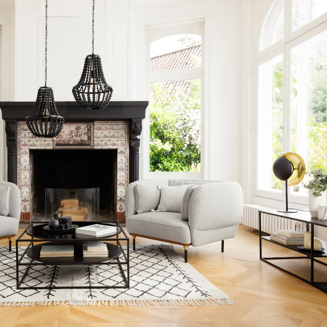 Installez votre lampe « Estee » sur un buffet en bois Atmospheraet ajoutez un tapis graphique à ses pieds.