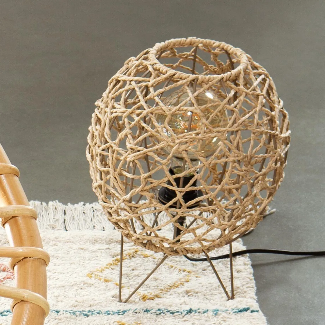 Cette lampe s’assortit avec des meubles naturels, comme un fauteuil en rotin Atmosphera ou un chiffonnier à tiroirs en tissu brodé.