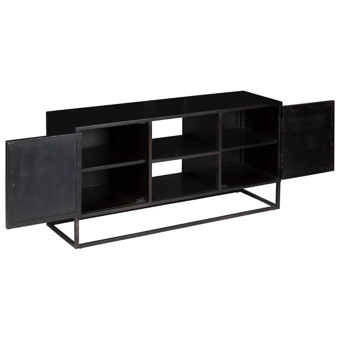 Ce meuble TV en métal vous offre la place nécessaire pour installer vos appareils multimédias sur les deux étagères ouvertes. Les compartiments clos par des portes accueilleront volontiers vos consoles de jeux et vos DVD.