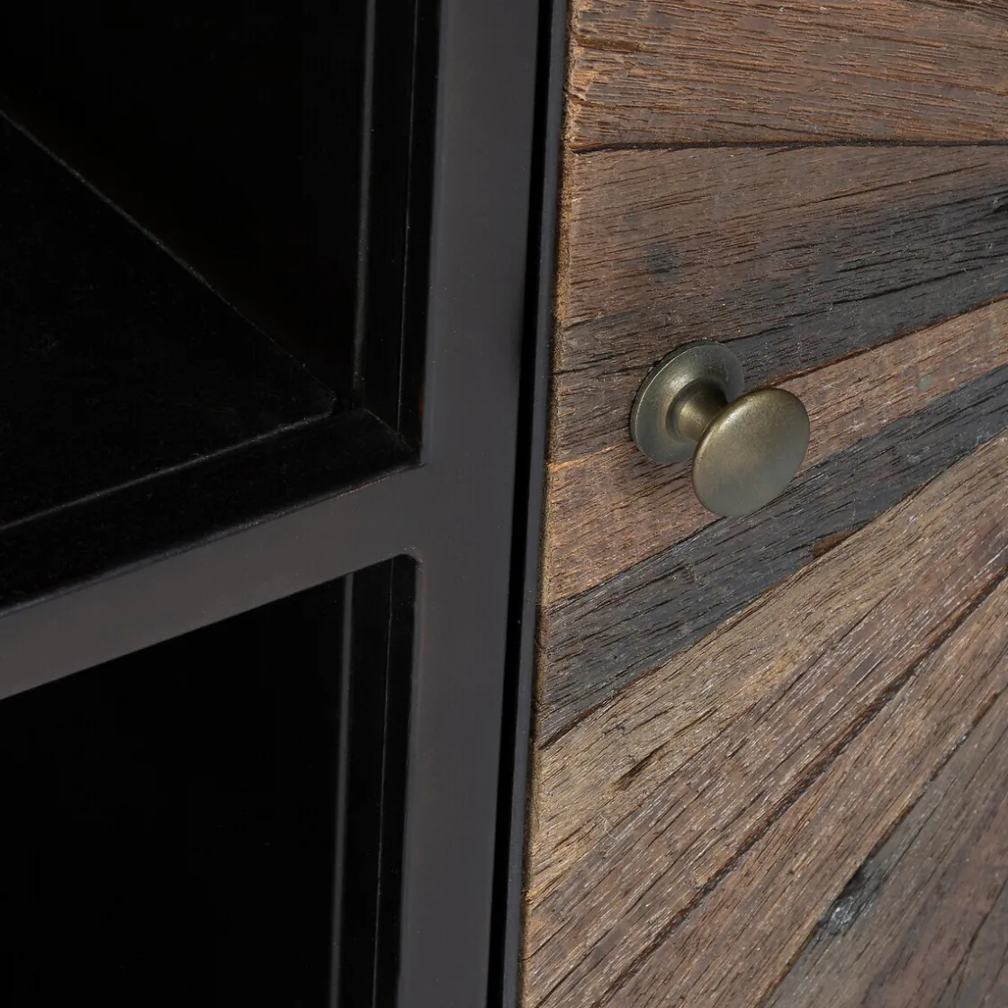 En métal antique et en bois, le meuble TV « Origins » a été fabriqué en Inde. Ce mélange de matières lui assure une bonne solidité au cours du temps. Le bois recyclé des portes provient d’anciens rails de chemin de fer, ce qui donne une note authentique au meuble.