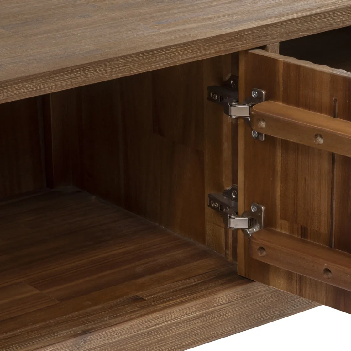 Le meuble TV « Sabor » est réalisé en bois d’acacia et se distingue par le fini cannelé des portes ainsi que par leurs poignées. Doté de deux étagères ouvertes et munies de passe câbles au dos, son placard vous permettra de ranger vos accessoires sur deux niveaux.