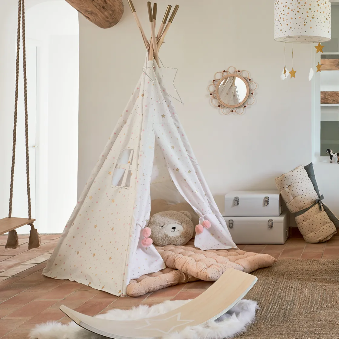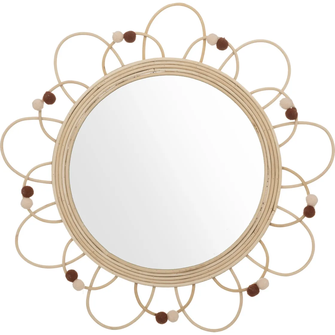 Le miroir rond en rotin est composé de plusieurs arceaux accompagnés de petits pompons. La matière naturelle apportera de la douceur et du relief à l’espace de votre bambin.