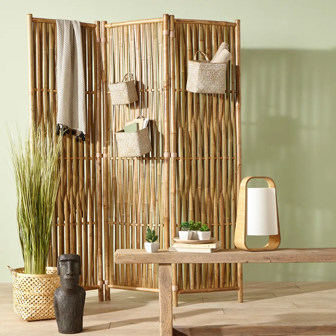 Composé de 3 panneaux en bambou naturel tressé articulés par des liens discrets, cet élégant paravent « Dream » au style bohème trouvera aisément sa place dans une chambre ou une entrée.