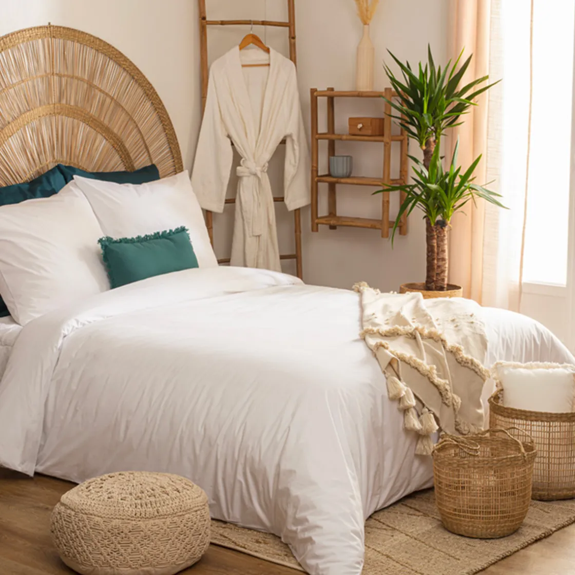 Cette parure de lit est en percale de coton, un tissu constitué de coton de qualité supérieure. Elle comprend une housse de couette 2 personnes et deux taies d’oreiller. Ces éléments vous envelopperont de douceur pour rendre votre lit encore plus cosy.