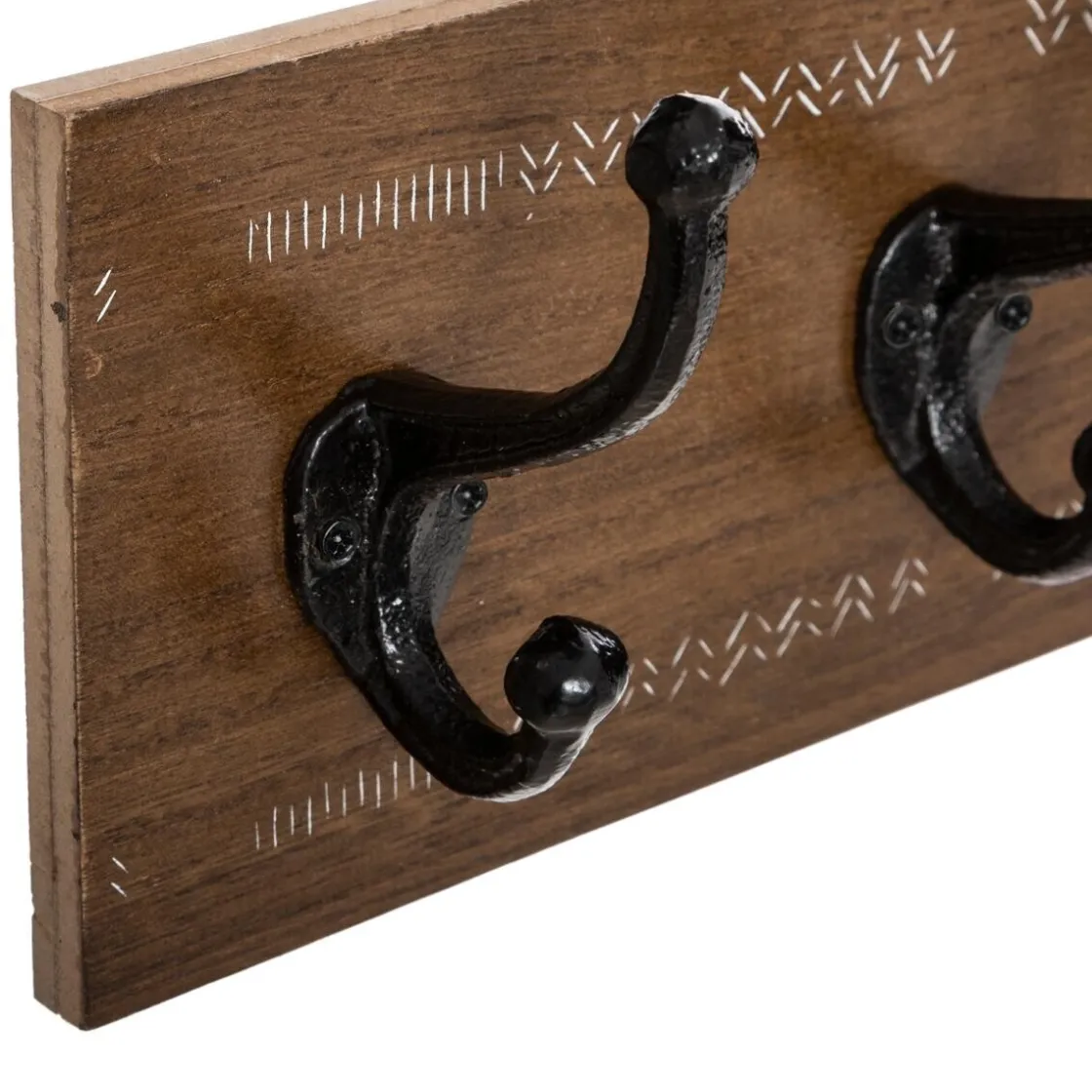 La structure façon bois brut est composée de 5 crochets qui vous permettront de suspendre vos vestes et écharpes. Le détail qui change tout : les motifs discrets gravés en blanc qui apportent une touche d’originalité et contrastent avec le bois foncé et le métal.