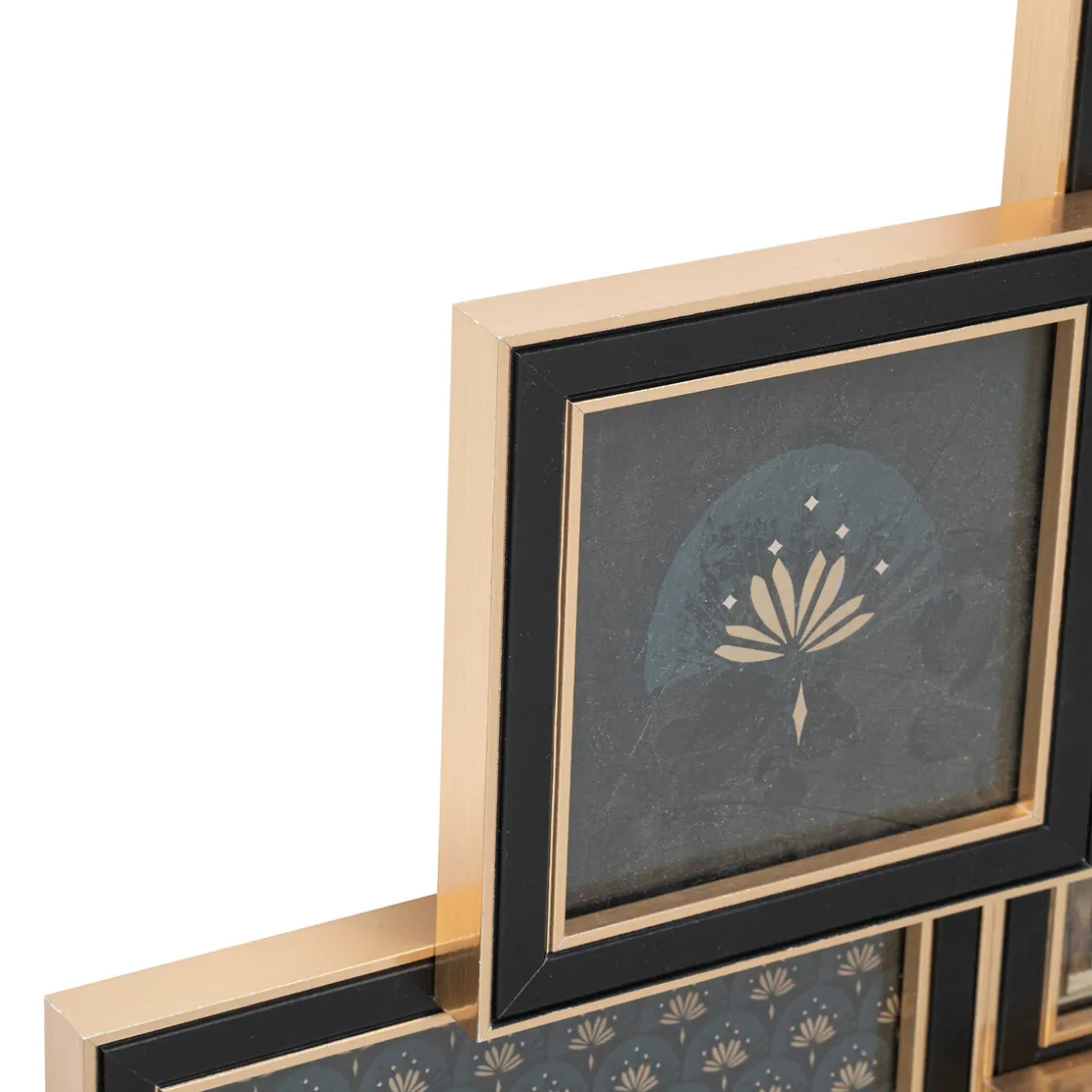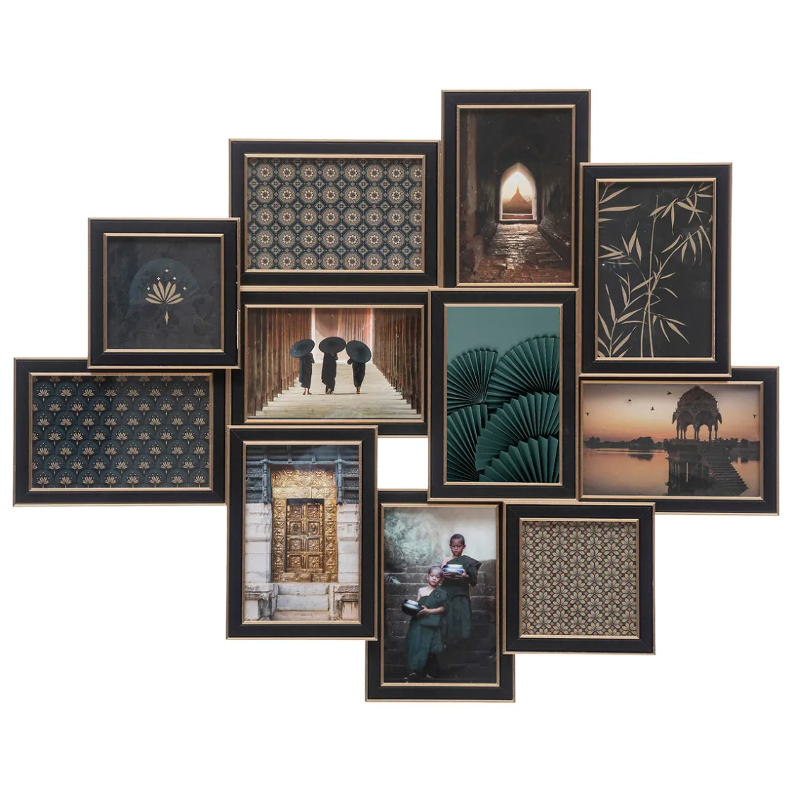 Composé de 11 cadres enchevêtrés et superposés, le pêle-mêle « Flavie » déposera une touche de préciosité dans votre déco. Réalisé en bois et peint dans des tons exotiques, vous pourrez y placer une sélection de photos comme y exposer des cartes rapportées de vos voyages. Doté de crochets, il se fixe facilement à un mur.