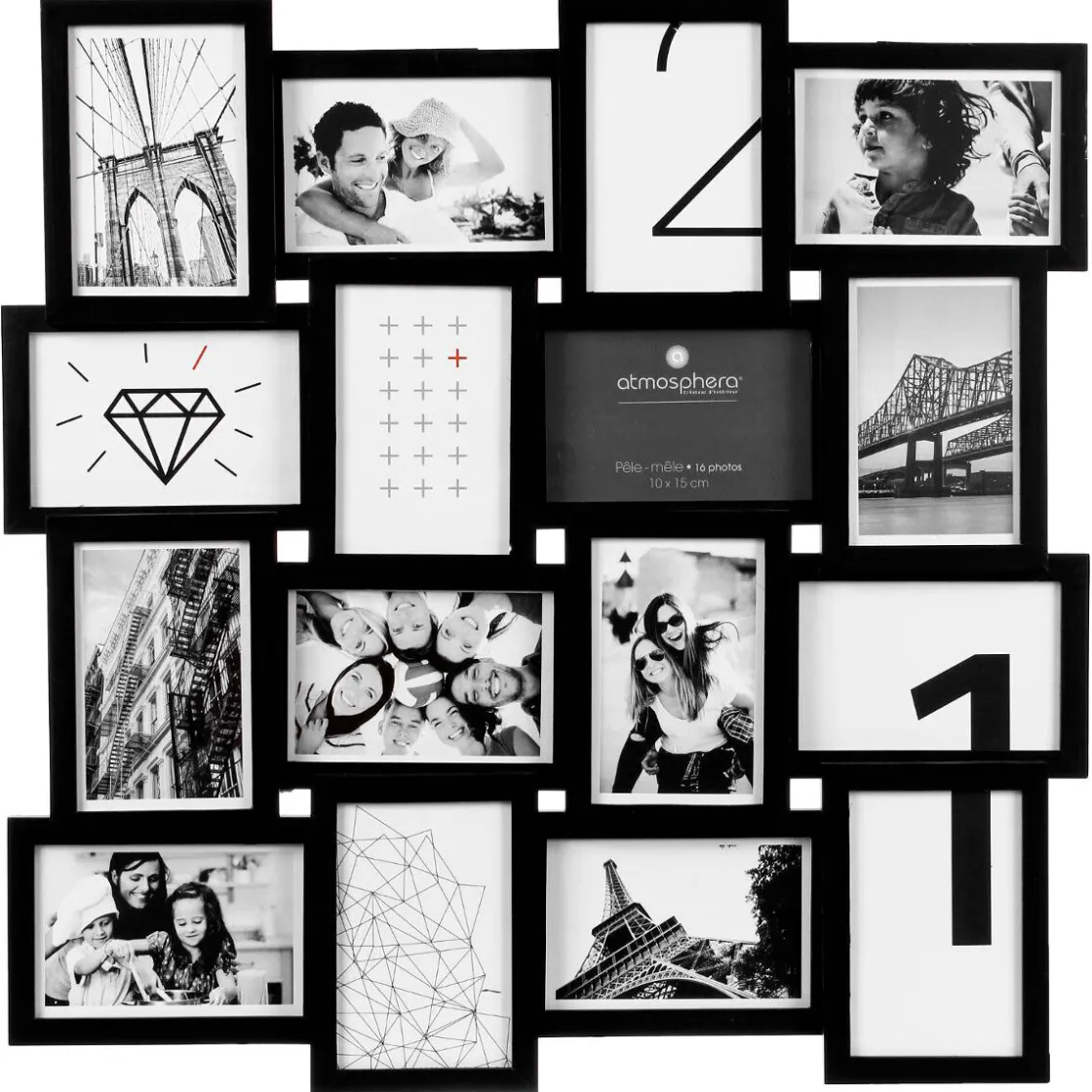 Composé de 16 cadres vitrés en bois de pin teinté, ce pêle-mêle « gael » offre de grandes dimensions et vous permettra d’exposer vos photos préférées aux formats portrait et paysage. Savamment enchevêtrés les uns dans les autres, ces cadres forment un ensemble au design très contemporain.