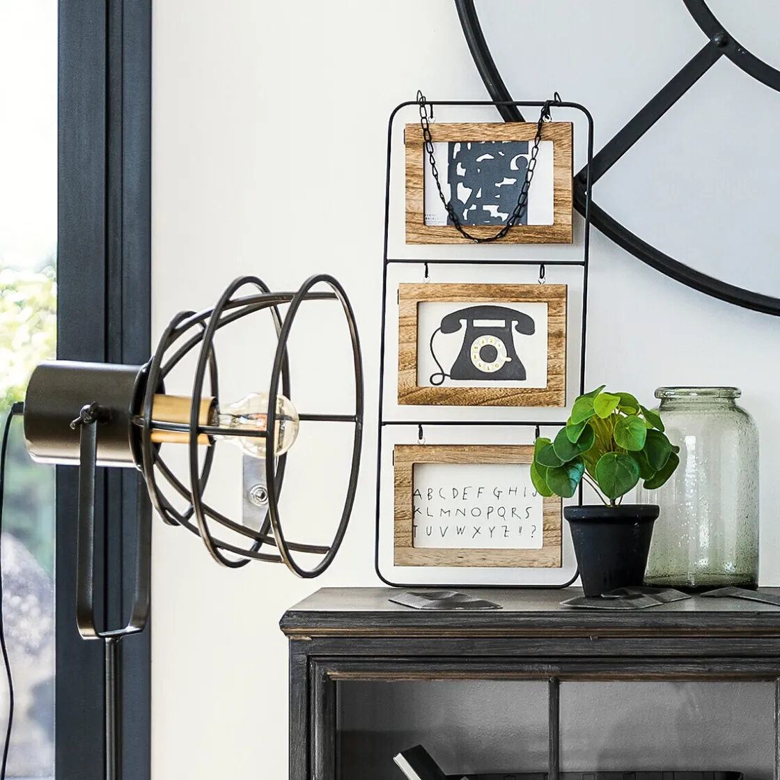 Ce pêle-mêle « Vivek » compte trois cadres recto-verso en fibres de bois accrochés à un montant métallique. Le tout est suspendu par une chaîne, qui donne un air vintage à cet accessoire. C’est un élément de déco parfait pour apporter une touche naturelle dans un intérieur industriel.