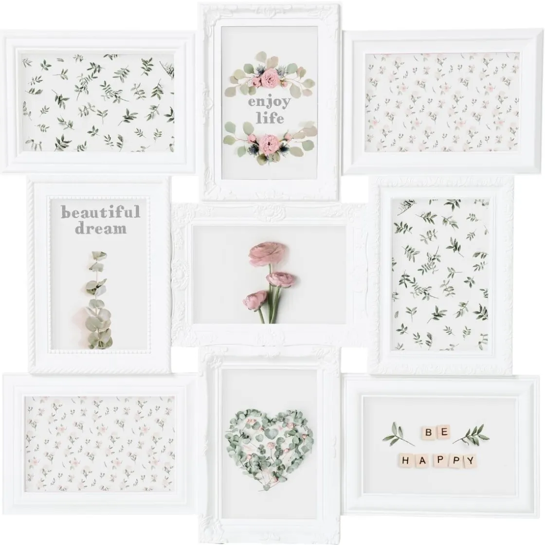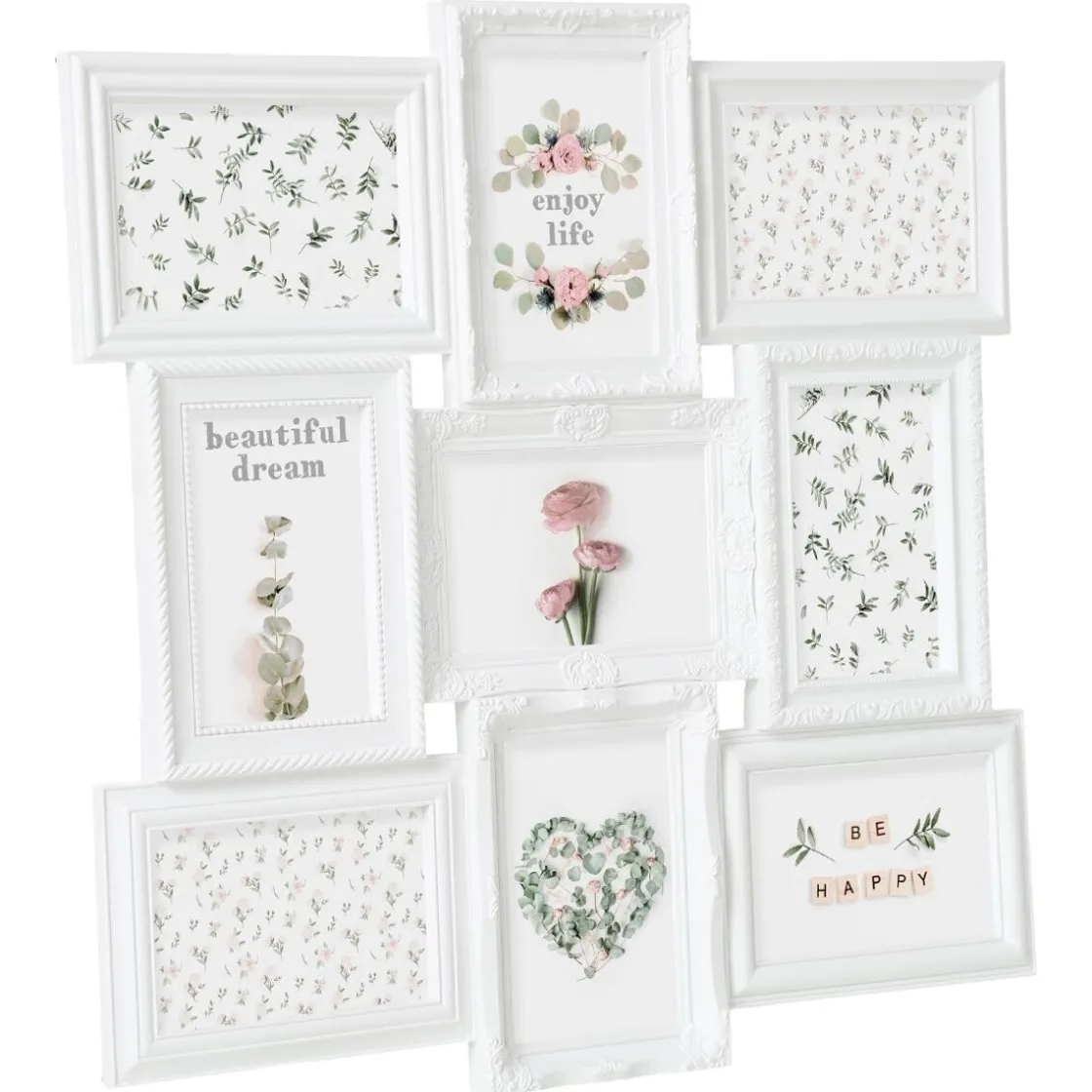 Composé de 9 cadres vitrés et enchevêtrés les uns dans les autres, ce grand pêle-mêle « suzy » accueillera votre sélection de photos aux formats paysage et portrait. Avec des contours à moulures ou semés de fleurs, ces cadres apporteront une touche bucolique dans votre déco.