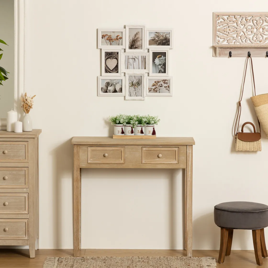 Accrochez votre pêle-mêle « suzy » au-dessus d’un buffet en bois blanchi Atmospheraet profitez d’une ambiance chaleureuse.