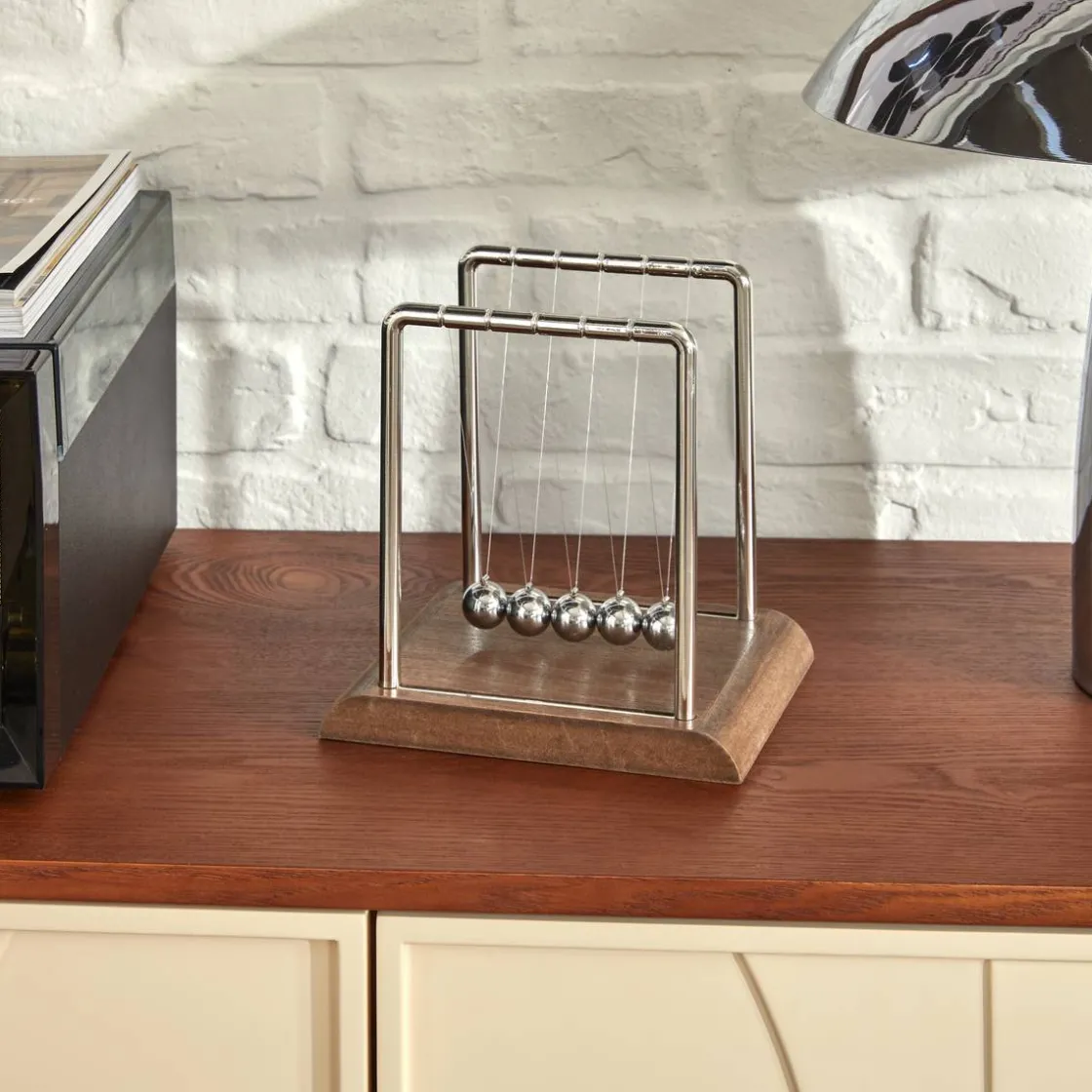 La déco à poser Sky Atmosphera reprend le célèbre jeu du pendule de Newton : 5 billes métalliques de masse identique sont suspendues sur une structure rigide par des fils. Le joueur soulève puis relâche une ou plusieurs billes pour observer ensuite un mouvement d’énergie cinétique. Monté sur un élégant support en bois foncé, ce jeu divertissant s’inscrit dans le style de la décoration scientifique et il sublimera votre univers déco d’une note sophistiquée. Associez-le à des matières nobles et placez-le sur une table basse pour profiter de moments conviviaux. Effet d’attraction garanti !