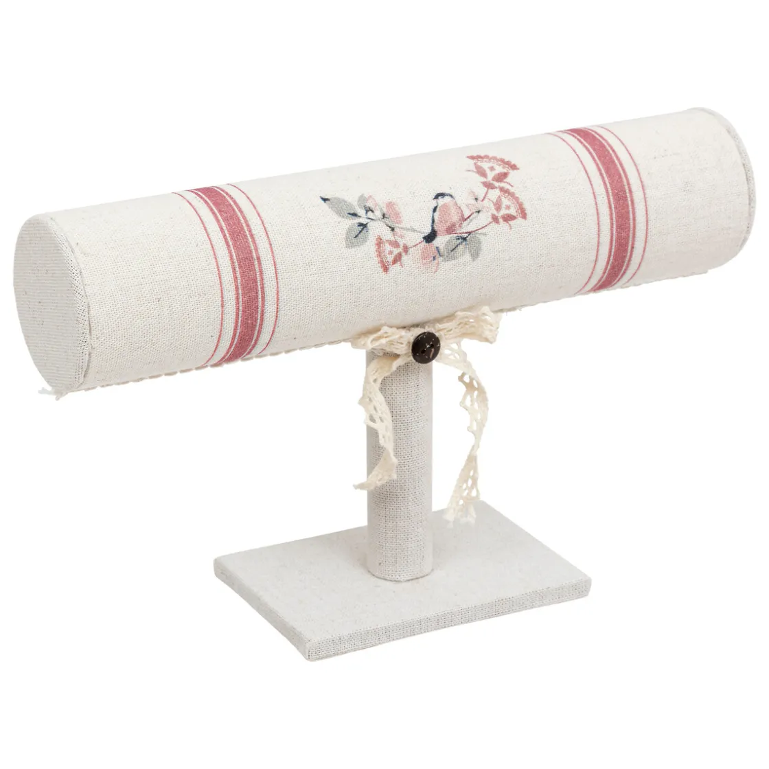 Le support cylindrique qui accueillera vos bracelets repose sur un pied bien stable. La structure est recouverte de tissu en lin de couleur naturelle avec une jolie inscription qui lui confère de l’authenticité. Un délicat noeud en dentelle apporte une touche romantique à l’ensemble.