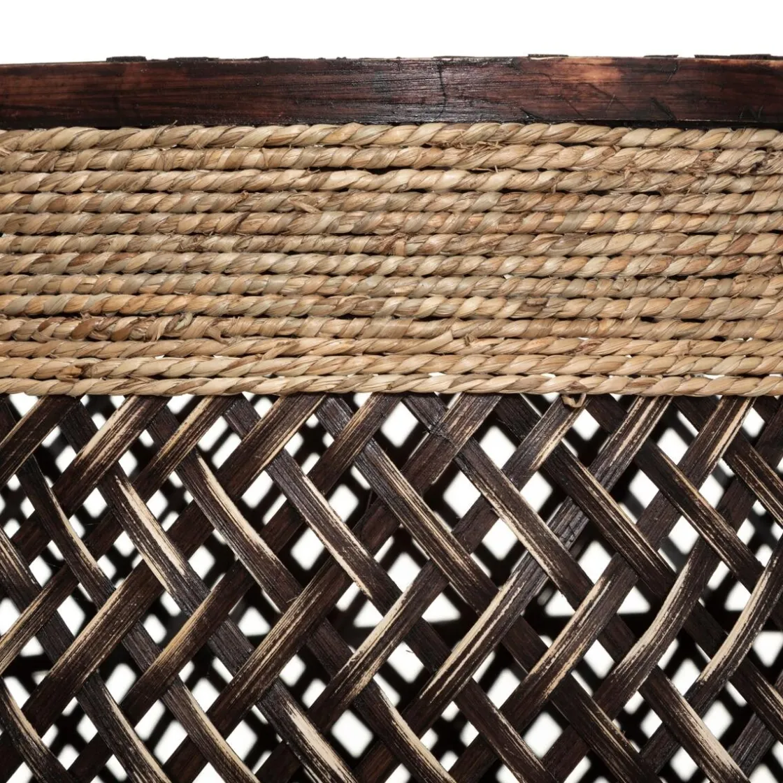 Ces accessoires sont exclusivement composés de matières naturelles. Les paniers en eux-mêmes sont formés d’un tressage quadrillé en bambou avec un liseré en roseau. Les anses sont en jute végétale. Évoquant le voyage et les envies d’ailleurs, ces objets semblent sortir d’un atelier d’artisanat du bout du monde.