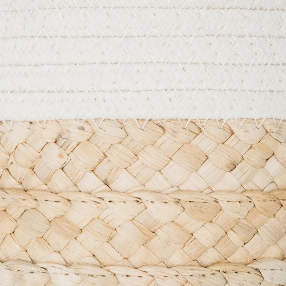Ces paniers associent la beauté de la fibre de maïs tressée à la douceur du coton, qui forme un bandeau entourant l’ouverture. Les poignées en tissu permettent de les transporter facilement.