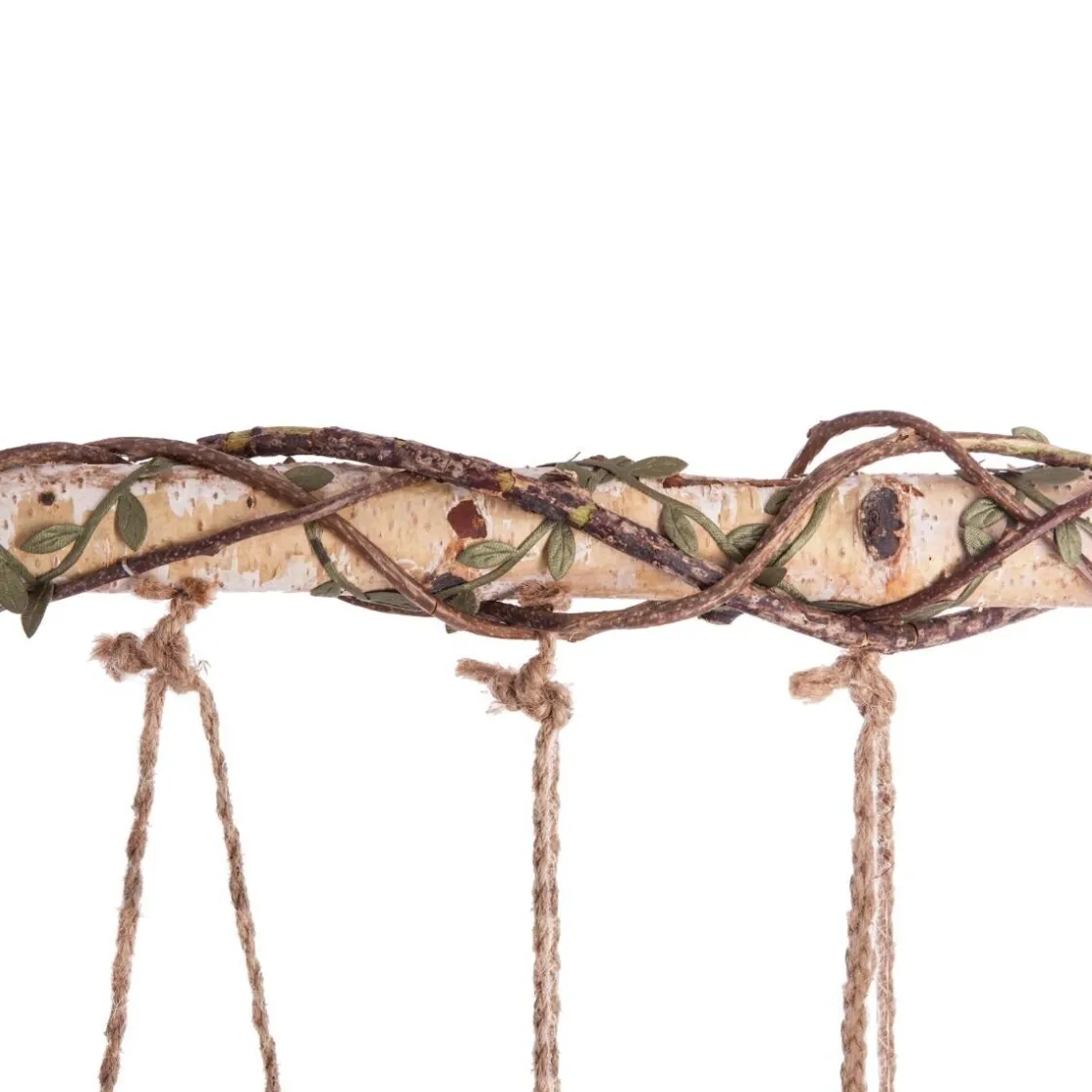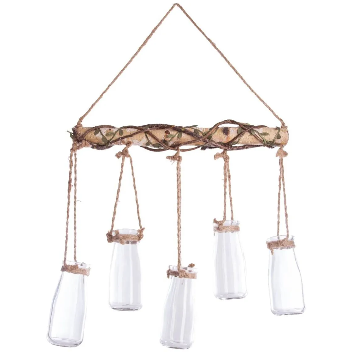 Ce set de 5 soliflores suspendus est composé d’une branche de bouleau à laquelle sont suspendues 5 bouteilles en verre transparent, toutes maintenues par des cordes en jute végétale. Des détails végétaux habillent cette branche de 40 cm de long pour une hauteur de 82 cm. Chaque soliflore pourra accueillir vos compositions de fleurs fraîches ou de fleurs séchées, au gré de vos envies!