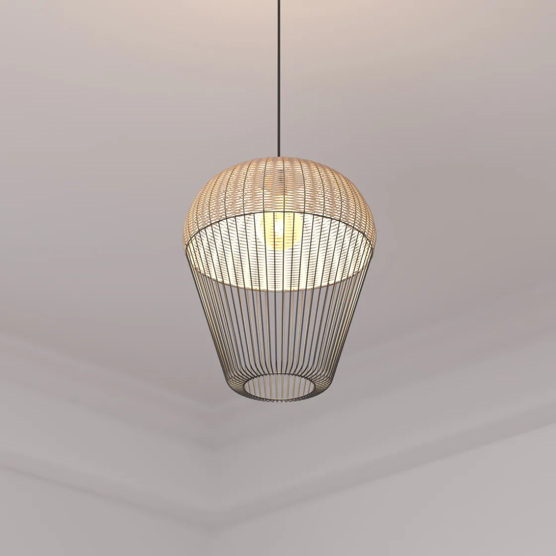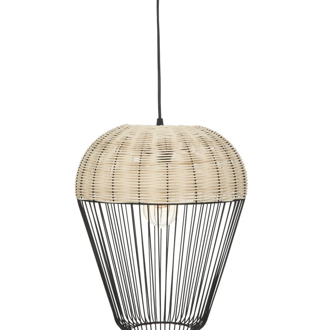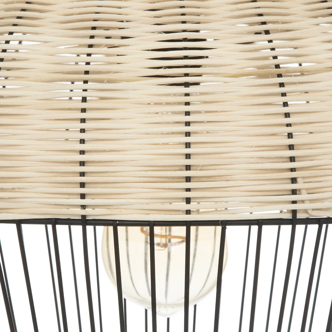 De format harmonieux, la suspension « Anea » est composée d’un abat-jour cage en métal, en forme de poire inversée. La partie supérieure est tressée de tiges de rotin dans un ton contrasté.