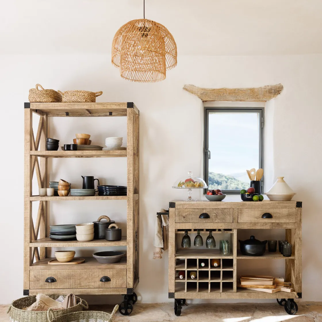 Dans un esprit ethnique chic, complétez votre décoration avec des coussins aux motifs berbères, un grand vase en verre et quelques plantes vertes.