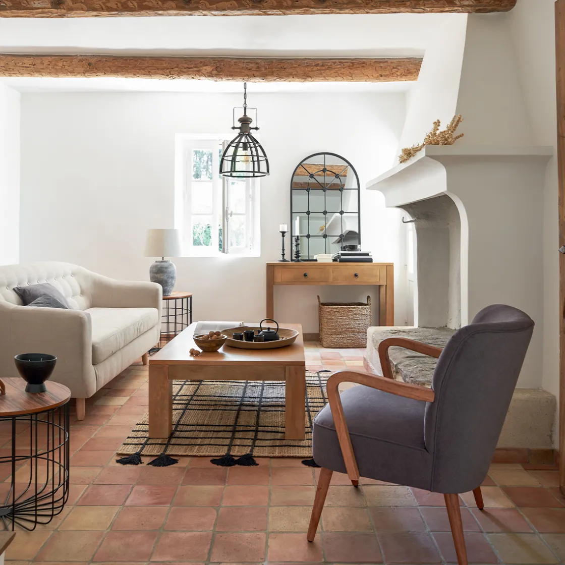 Soulignez le côté manufacture de cette suspension en l’intégrant à un ensemble de mobilier en bois foncé comme du noyer et des sièges aspect cuir vieilli.