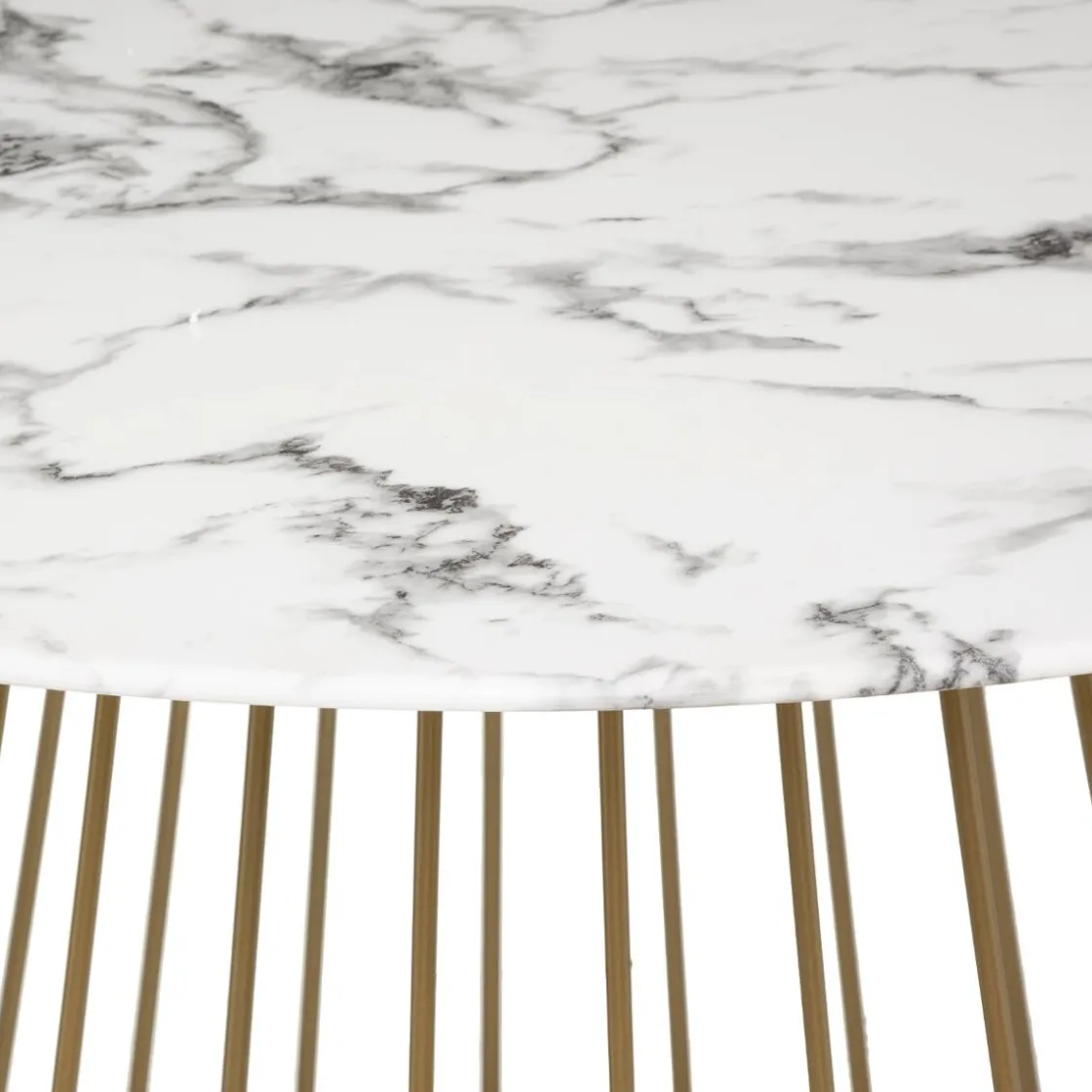 Composée d’une structure en fer légèrement conique qui soutient un plateau rond en verre trempé effet marbre, cette table apportera une touche chic et élégante à votre salle à manger.