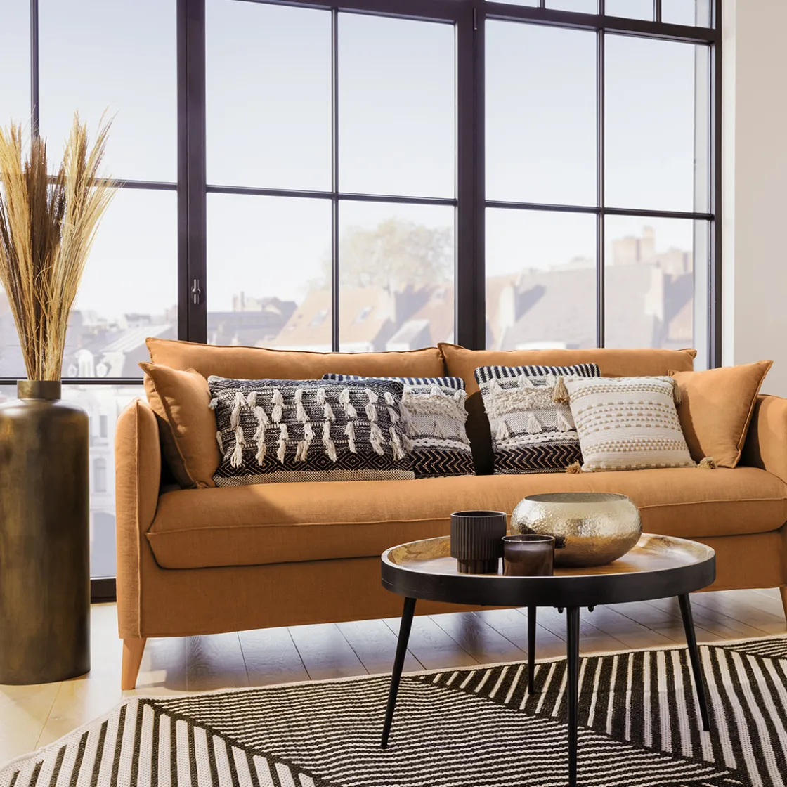 Tirez parti de l’esthétique géométrique de la table basse « Siwan » en la mariant avec un canapé à pieds biseautés ou des poufs ronds Atmosphera.