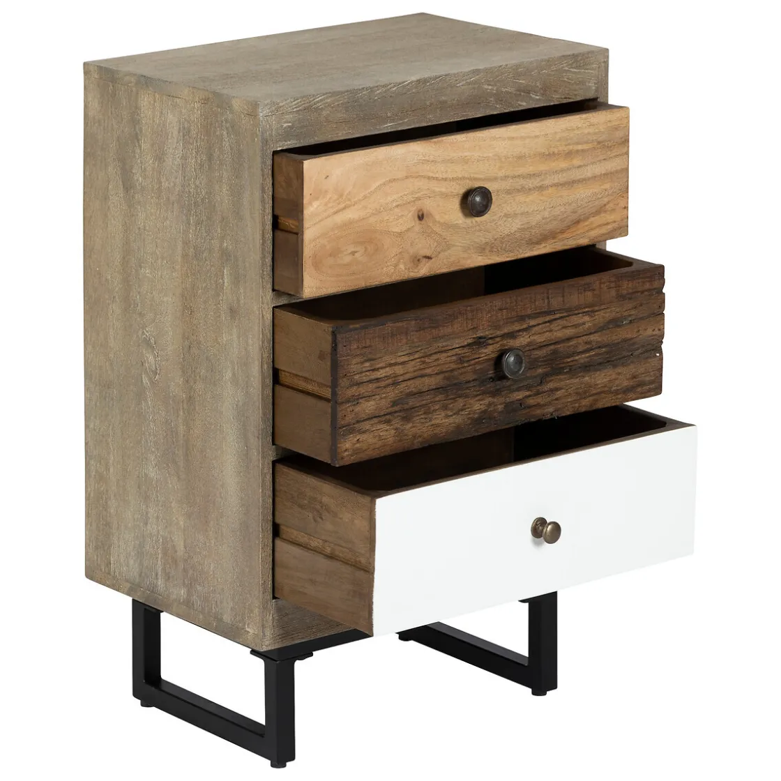 Cette table de chevet « Koval » est ornée de motifs différents sur son tiroir du haut et du bas. Le tiroir du milieu, lui, arbore un fini bois vieilli. Tout aussi pratique qu’atypique, elle possède 2 poignées métalliques différentes.