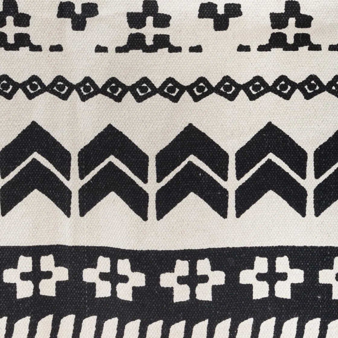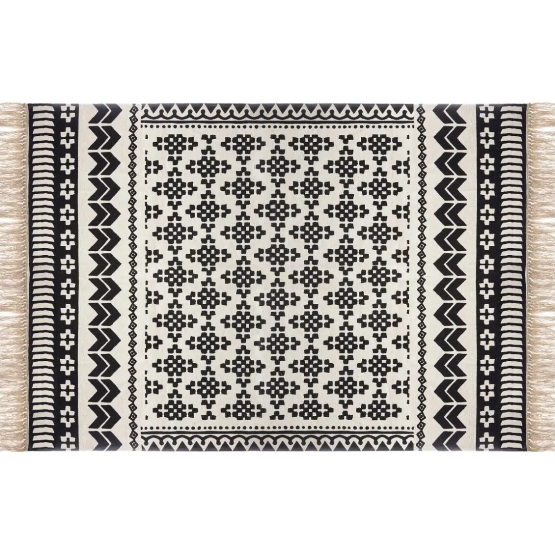 Tapis tissé 100% coton aux motifs géométriques bicolores et finition à franges.