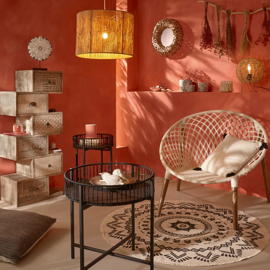 Des meubles en bois de manguier Atmosphera et une suspension en rotin complèteront un coin séjour à l’esprit berbère.