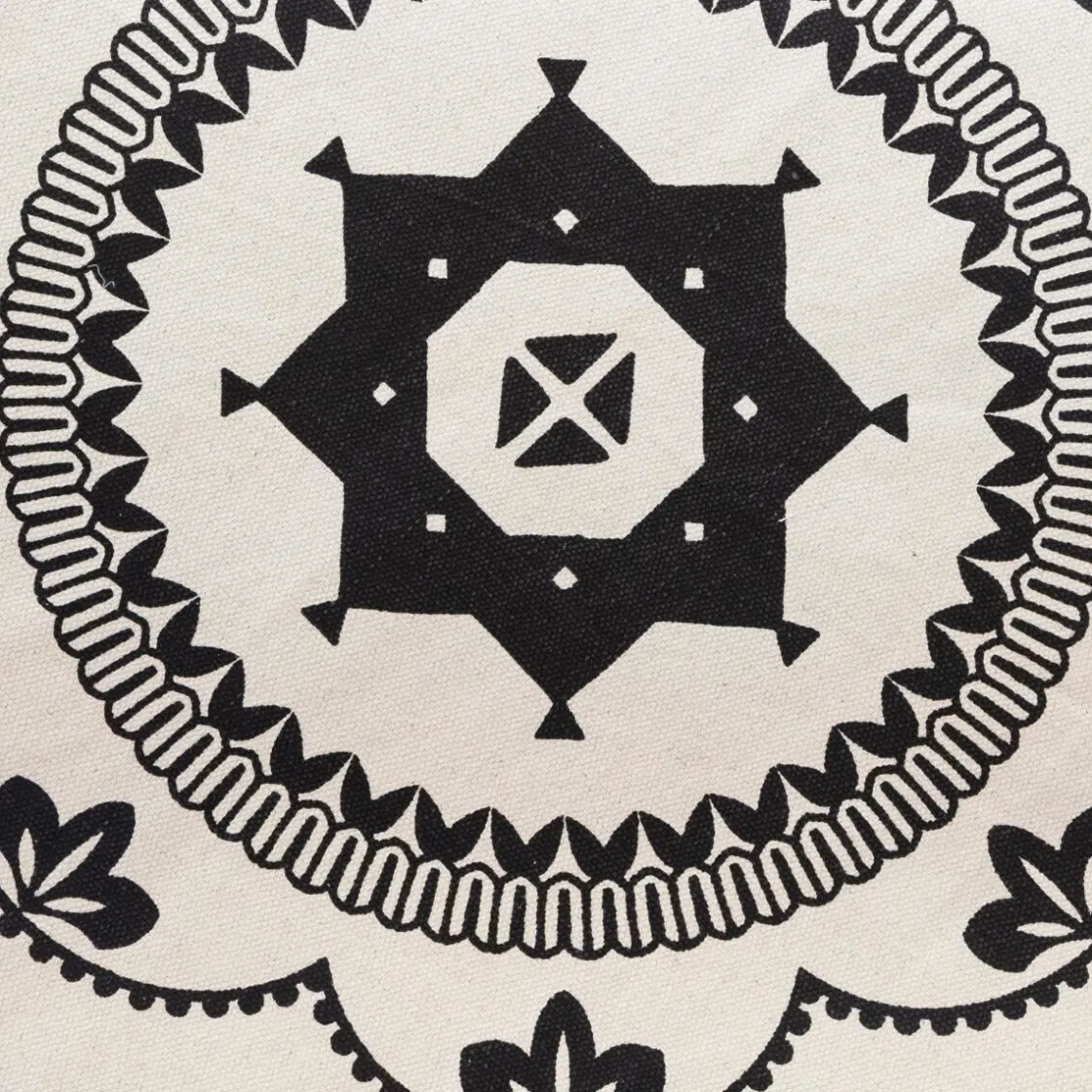 Entouré d’une bordure à fines franges, ce tapis en coton affiche des motifs géométriques organisés en cercles concentriques.