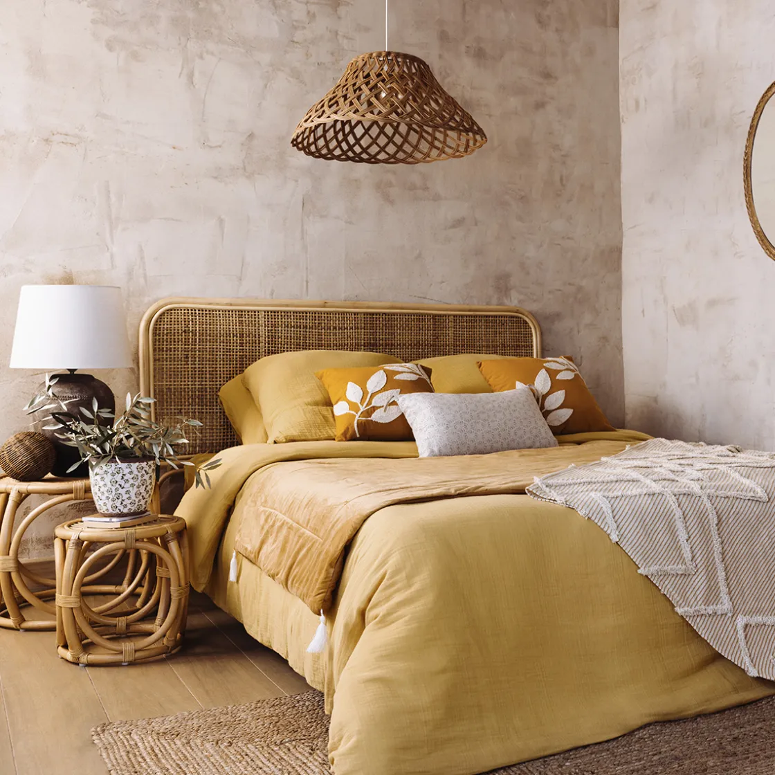 Le rotin se mariera à merveille avec d’autres matières naturelles. Choisissez du linge de lit en coton ou en lin pour un confort optimal.