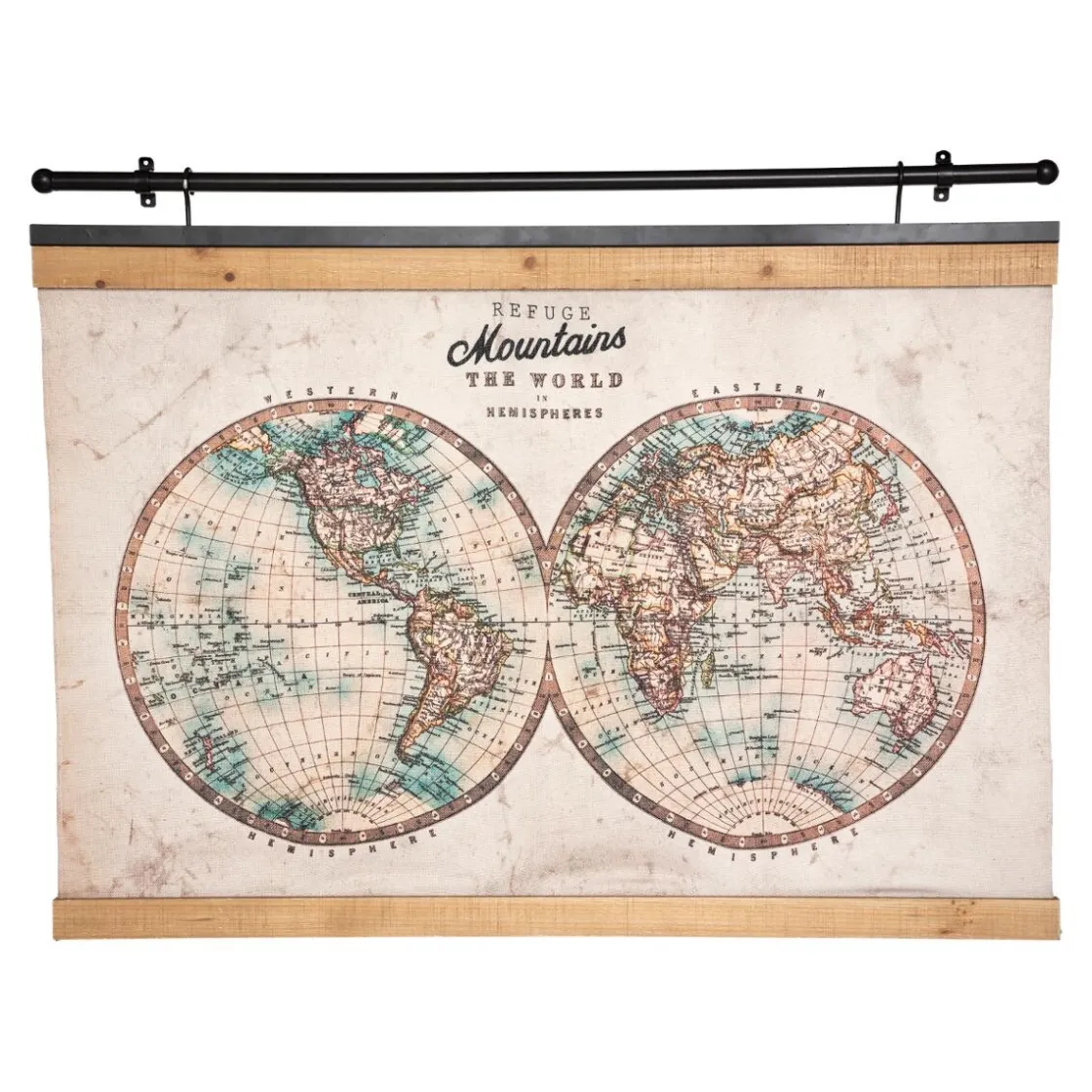 Cette mappemonde au style ancien habillera les murs d’une pièce de travail meublée d’un bureau en bois et métal Atmosphera.
